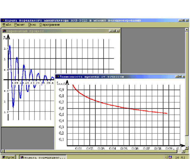 Вычисление параметров переходного процесса в программе осуществляется с использованием выражения (2.31) при помощи которого вычисляется амплитуда колебаний рабочего органа манипулятора. По полученным значениям строится график переходного процесса и график зависимости времени переходного процесса от точности позиционирования.