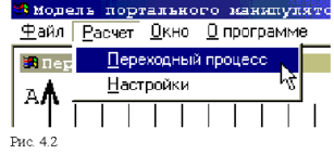 Для исследования полученной динамической модели, построения графиков приведенных в работе, использовалась программа “Модель портального манипулятора МРЛ-901П в момент позиционирования” (см. рис. 4.1). Программа разработана для среды WIN32 API на языке C++ с использованием компилятора Borland C++ 5.02 и может выполняться на операционных системах Windows 95/98 и Windows NT.