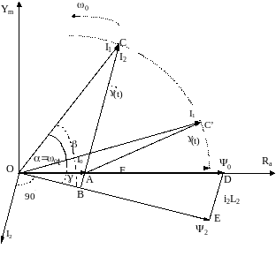 Из Т-образной схемы замещения (рис. 3) видно, что , то есть векторы тока и потокосцепления ротора взаимно перпендикулярны. В процессе поворота угол между векторами I0 и Y2 g(t) будет изменяться согласно выражения: (1), где a=w0t - текущий угол между вектором тока статора и действительной осью Ra. В момент времени t2 вектор тока статора I1 займет положение OC, при котором векторы тока ротора I2 и потокосцепления ротора Y2 взаимно перпендикулярны, то есть g(t2)=g.