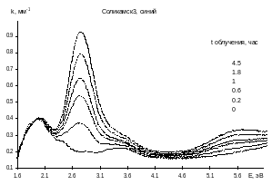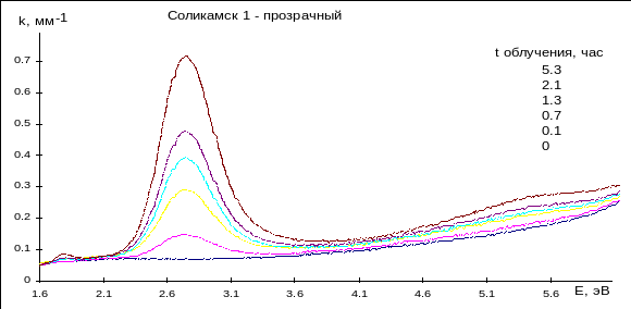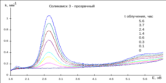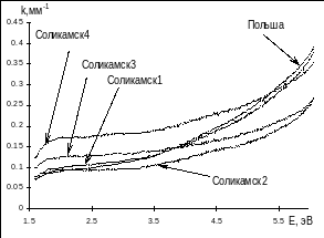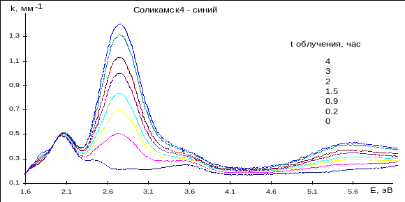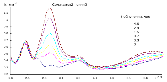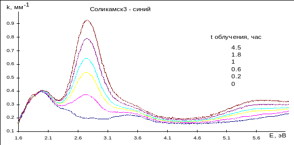 Для измерения спектров оптического поглощения были использованы синие и прозрачные пластинки образцов галита толщиной от 0,5 до 2,5 мм и площадью около 3 см2. Из одной пробы было приготовлено по несколько пластин. Съемка спектров поглощения производилась с записью на магнитный носитель компьютером ДВК 4, в режиме измерения оптической плотности. Спектральные массивы в дальнейшем обрабатывались на компьютере IBM с применением специальных программ построения спектра и стандартных программ типа Origin и Excel. Они пересчитывались в коэффициенты поглощения k (мм-1). Спектры оптического поглощения всех пластин представлены на рис.1 Приложения.