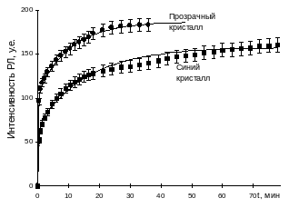 Рис.5. Разгорание рентгенолюминесценции в образцах синей и прозрачной разности галита в полосах (сверху - вниз): 390 - 460 - 250 нм.