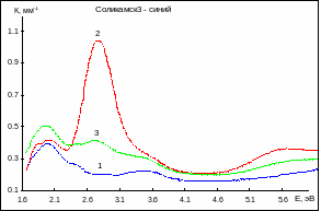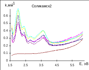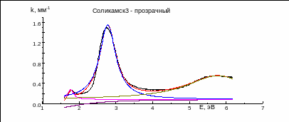 Спектры синей и бесцветной соли, полученные на различных пластинках из цветовых разностей одного образца, для дальнейшего анализа были усреднены. Они отдельно представлены на рис.5. В образце Соликамск4 присутствовали две сильно отличные синие разности. Первая имеет светло-голубую окраску, вторая имеет темно-синюю, насыщенную окраску. Основную массу образца слагает первая разность, вторая находится в виде вкраплений. Для данных разностей приведены отдельные спектры. Из спектров видно, что все окрашенные образцы имеет подобные многокомпонентные спектры. Спектры прозрачных образцов максимумов не имеют - коэффициент поглощения в них плавно возрастает в высокоэнергетической области спектра, соответствующей УФ области спектра. Этот подъем обусловлен рэлеевским рассеянием, интенсивность которого растет пропорционально -4.