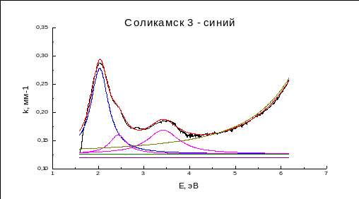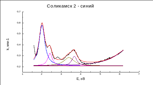 Спектры оптического поглощения синих образцов, после разложения на отдельные Лоренцевы составляющие, имеют пять общих максимумов с примерными положениями 1.9, 2.4, 2.8, 3.4, 3.6эВ. В спектре оптического поглощения образца синей разности Соликамск1 выделены полосы 1.95, 2.43, 2.88, 3.37, 3.70эВ, что соответствует 634, 509, 429, 367, 334нм. В спектре синего образца Соликамск2 выделяются максимумы при 2.00, 2.42, 3.39 и 3.67эВ. Соответствующие им значения в нм - 618, 511, 365, 337. Максимум в полосе 2.8эВ данным разложением выделить не удалось. Разложение на отдельные Лоренцевы составляющие спектра оптического поглощения синего образца Соликамск3 показало наличие максимумов в полосе 2.03, 2.44, 3.42эВ, соответственно 609, 507, 361нм. В спектре этого образца отсутствуют полосы поглощения 2.8 и 3.4эВ. Спектр поглощения образца Соликамск4 темно-синего цвета отличается от спектра образца Соликамск4 и от всех других образцов. Форма первой полосы отличается от других образцов своей закругленностью. что, вероятно, связано с ее неэлементарностью. В этом образце выделены следующие полосы: 1.99, 2.42, 2.84, 3.20, 3.49эВ, что соответствует 621, 511, 435, 386, 354нм. В спектре оптического поглощения синего образца Соликамск4 выделены полосы: 2.04, 2.48, 2.90, 3.39, 3.64эВ и соответственно им 606, 498, 426, 365, 340нм. Спектр оптического поглощения синего образца из Польши содержит полосы поглощения :1.89, 2.37, 2.79, 3.22, 3.57эВ, что соответствует 654, 522, 443, 384, 346нм.