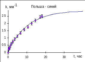 Рис.6. Зависимость коэффициента поглощения от времени облучения рентгеновским излучением в полосе F-центра.