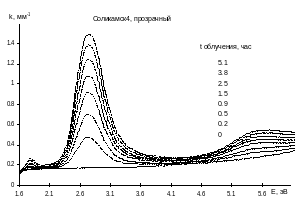 Рис.3. Эволюция спектров оптического поглощения каменной соли при облучении рентгеновским излучением.