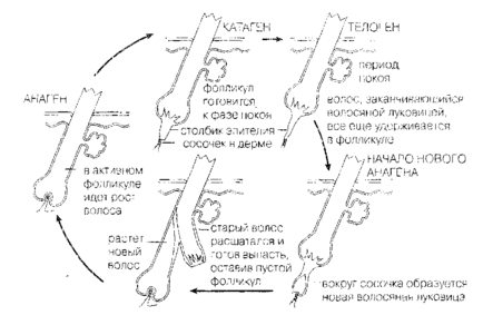 Продолжительность жизни отдельных волос варьируется в широких пределах и зависит от изменений, происходящих в организме. Некоторые волосы активно растут, тогда как другие пребывают в состоянии покоя. Волосы на голове находятся в различных стадиях роста.