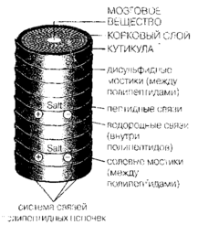 Кератин в волосе образует длинные цепочки, которые упакованы витками, как в пружинках. Витки удерживаются поперечными связями между цепочками. Это дисульфидные мостики, солевые мостики и водородные связи. Два последних вида связей относительно слабые и легко разрываются, в результате чего «пружинки» распрямляются: именно это происходит в процессе завивки волос. Обычная спиральная форма кератина называется альфа-кератином; в процессе вытягивания, укладывания и сушки он трансформируется в бета-кератин. Такое изменение - временное. Как только волос намокнет или постепенно впитает определенное количество влаги из воздуха, кератин вернется в состояние альфа. Дисульфидные мостики гораздо прочнее, но и на них можно воздействовать, что и происходит во время перманентной завивки.