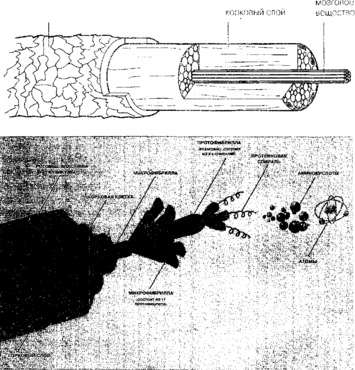 Пучки волокон, пронизывающих корковый слой, образуются молекулами аминокислот. В волосах присутствуют двадцать две аминокислоты, и молекулы каждой характеризуются определенными пропорциями содержания атомов разных элементов. В среднем волосы содержат (в %):