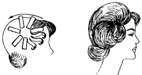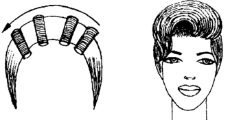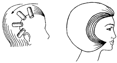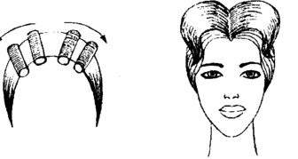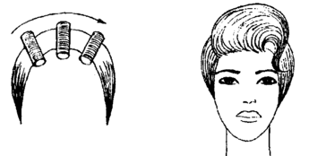 Накручивание волос производится следующим образом: мастер стоит лицом в сторону накручивания волос и редкой стороной расчески, которую держит в правой руке, отделяет прядь волос шириной, немного меньшей ширины бигуди, и толщиной около 1 см. Волосы он перекладывает в левую руку, а правой кладет их между трубкой и крылышками бигуди, оттягивает бигуди до конца пряди волос и начинает ее накручивать. При этом он должен следить, чтобы концы волос лежали между трубкой и крылышками и при накручивании не торчали в стороны, иначе торчать они будут и после расчесывания. Если волосы в пряди с одной стороны длиннее, а с другой - короче, го бигуди ставят под углом, зажимая все концы волос одновременно, так как при накручивании бигуди выровняются и примут горизонтальное положение. После накручивания волосы высушивают, бигуди снимают и локоны расчесывают расческой и массажной щеткой. Расчесывать начинают с нижних локонов и заканчивают верхними. После расчесывания легким толчком ребра ладони (со стороны мизинца) волнам волос придают необходимое направление.
