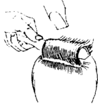 Последнюю волну обрабатывают иначе: после образования последнего крона концы волос расчесывают от указательного пальца левой руки не вниз, как обычно, а в ту сторону, куда требовалось бы сдвинуть расческой волосы для образования следующего крона.
