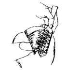 После расчесывания пряди необходимо прижать волосы с правой стороны средним пальцем левой руки в 3-4 см от основания. Затем нужно взять расческу в правую руку и ввести ее частой стороной зубьев в волосы вплотную к среднему пальцу и параллельно ему. Зубья расчески при этом располагаются перпендикулярно пряди волос. Далее движением расчески вдоль ее плоскости сдвигают волосы захваченной части пряди вправо на 1-1,5 см. При перемещении волос вправо между средним пальцем левой руки, прижимающим волосы, и расческой образуется первая линия волны (крон). После образования крона, не вынимая зубьев расчески из волос, наклоняют ее обушок к себе под углом примерно 45°, а указательным пальцем левой руки плотно прижимают волосы между расческой и уже образованной линией волны. Одновременно указательный палец левой руки должен скользить по внешней от мастера стороне расчески от ее обушка к кончикам зубьев. Учитывая, что расческа находится под углом 45° к пряди, указательный палец левой руки, скользя по ее плоскости вниз, будет сжимать линию волны так, что последняя окажется между ним и средним пальцем. Затем расчесывают волосы, расположенные ниже указательного пальца левой руки, и переходят к обработке левой стороны пряди.