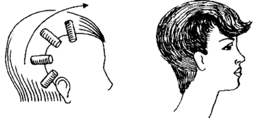 При зачесывании волос назад на участке головы от лба к затылку бигуди лежат параллельно лбу, на боковых частях головы - вертикально по отношению ко лбу, на участках головы между боками и теменем - наклонно. На затылке бигуди закручивают вниз. Затем волосы расчесывают расческой и щеткой, после чего ребром ладони придают направление волнам.