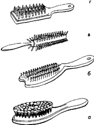 Щетки для волос: а - с частой щетиной; б - круглая; в - овальная; г - широкая прямоугольная с редкими зубьями