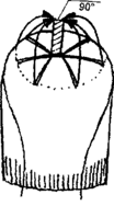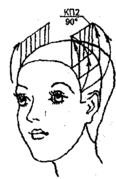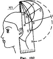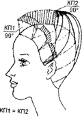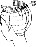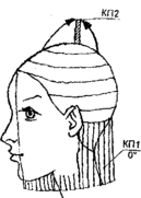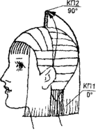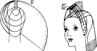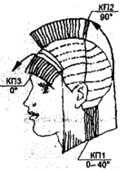 КП1, оттяжка 90° - для височных и теменной зон. КП1 = КП2 по длине (рис. 10, 11).