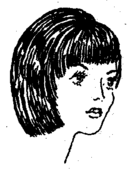 Определить длину КП2 (3-6 см) и ее место на голове выбрать в зависимости от длины волос, длины челки и внешнего облика. Можно получить каскадный эффект из нескольких радиальных прядей, взятых вокруг КП (рис. 15). Для пышных слегка вьющихся волос этот прием очень эффектен. На рис. 16 изображена длина волос с оттяжкой в пространстве 90°: аа, бб, вв. В данном случае концы волос находятся па разных уровнях по длине при срезании па уровне КП.