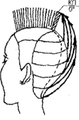 В нижнезатылочиой зоне горизонтальным пробором отделить и начесать на шею прядь с оттяжкой 0° (рис. 2). Выполнить прямую или вогнутую окантовку пряди, принять ее за контрольную прядь - КП1 с оттяжкой 0°. Стричь нижнезатылочную зону по КП1 с оттяжкой 0° методом наложения пряди на прядь по проборам через 1 см.