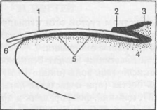 Мал. 1. Будова нігтя: 1 – нігтьова пластинка, 2 – нігтьова кожіця, 3 – задній нігтьовий вал, 4 – матриця нігтя, 5 – нігтьове ложе, 6 – піднігтьова щілина
