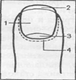 Мал. 2. Будова нігтьової пластинки: 1 – тіло нігтя, 2 – вільний край, 3 – луночка, 4 – нігтьові вали