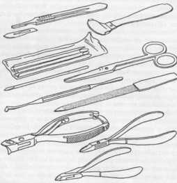 Робота манікюрниці і педикюрші пов'язана з проведенням маніпуляцій не тільки на нігтях, але і на шкірі: видалення надкожиці у підстави нігтя, задирок, мозолів, натоптишів і інших утворень із застосуванням різних інструментів (ножиці, щипці, пили, кусачки, спеціальні бори для обробки нігтів) (мал. 4, 5) і перев'язувального матеріалу (марлеві серветки, ватяні тампони), медикаментів (йод, спирт, синтомицинова емульсія, розчин марганцевокислого калію).