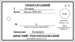Рис. 1.1. Зразок оформлення ярлика ф. 10 в об’єктах поштового зв’язку, не оснащених АРМ ВЗ