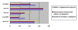 Около 70% учителей английского языка затрудняются в организации внеклассной работы по предмету и в формировании у обучающихся интереса к иностранному языку. По работе с одаренными детьми испытывают затруднения в большинстве своем педагоги гуманитарного цикла (учителя русского языка и литературы).