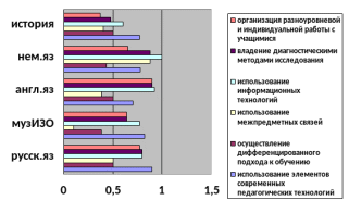 Нами было отмечено, что учитель осознает систему своей работы, свои достижения, а также затруднения и недостатки, он активно использует на уроке методики выбора оптимальных методов, форм и средств обучения, ответственно подходит к отбору учебного материала, выносимого на урок.