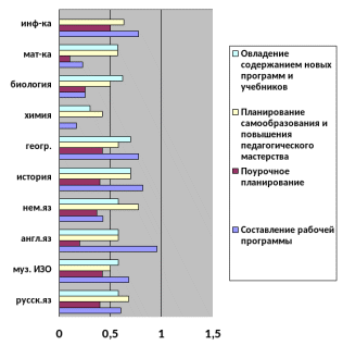По самооценке, 54% педагогов имеют затруднения в вопросах планирования педагогической деятельности (рис.1). анкетирование показало, что меньше всего затрудняются в планировании своей работы учителя химии, так, например, у них не возникает трудностей в написании поурочных планов. Максимальные затруднения по этому показателю имеют учителя истории и информатики, а именно в вопросах, связанных с составлением рабочей программы, с овладением содержания новых программ и с планирование самообразования (рис.2). Большое количество учителей английского языка не достаточно владеют навыком составления рабочей программы (рис.1).