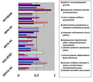 У учителей английского, немецкого и русского языков возникают проблемы по работе с неуспевающими детьми. Самую высокую информационную потребность испытывают эти учителя в описании собственного опыта работы. Следует обратить внимание, что педагоги немецкого и русского языков испытывают затруднения в умении провести самоанализ урока и в использовании эффективных форм обучения в большем количестве, в отличие от учителей английского языка. Ниже представлена диаграмма, которая поможет сформировать целостную картину об информационных потребностях педагогов гуманитарного цикла.