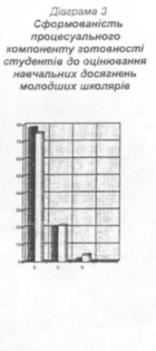 Високий рівень сформованості процесуального компоненту готовності виявляють пише окремі студенти IV-V курсів (3,8%). Більшість респондентів не усвідомлюють структурної складності процесу оцінювання, розглядають його як акт повідомлення оцінки учневі. Найскладнішим діагностичним завданням стало визначення операційного складу оцінювання, аналіз власної діяльності та діяльності вчителів з позиції структури, змісту та послідовності реалізації оцінних дій. Студенти не можуть визначити й охарактеризувати послідовність дій, які вони виконали, оцінюючи результати навчально-пізнавальної діяльності школярів.
