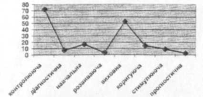 Рангова крива підтверджує, що переважна більшість респондентів підкреслює значущість контролюючої та виховної функцій оцінювання. Однак, надання їм абсолютної переваги стає причиною диспропорції в організації процесу навчання молодших школярів. Виявлена тенденція усвідомлення оцінювання тільки як засобу контролюючого та виховного впливу (до речі, досить часто цей вплив має негативну спрямованість оцінки-покарання), вказує на відсутність системного бачення майбутніми вчителями функцій оцінювання та можливостей їх комплексної реалізації у процесі навчання молодших школярів.