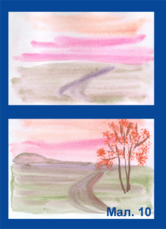 Малювання по мокрому фону аквареллю можна проводити при зображенні осіннього або весняного пейзажу.(Мал. 11)