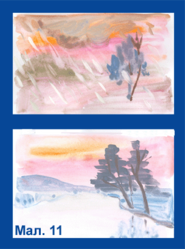 Якщо гуашеві фарби краще давати дітям для зображення таких пір року як зима, осінь, то для літніх та весняних пейзажів можна використовувати акварель. Вчитель навчає дітей розводити фарби водою, отримуючи потрібні відтінки для малювання ніжної весняної зелені, легких пелюстків і т.д. (Мал. 10)