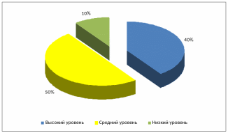 Как видно, к высокому уровню относится 40% детей, к среднему – 50% детей, к низкому – 10% детей.