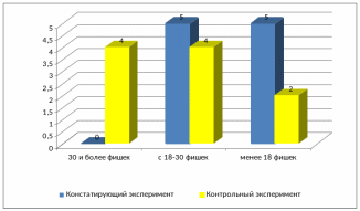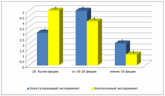 На контрольном эксперименте в группе испытуемых увеличилось детей до 5 человек, которые набрали 26 и более фишек, т.е. набрали наибольшее количество прилагательных к заданным словам.