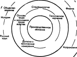 Викладач загальноосвітніх і спеціальних дисциплін повинний добре орієнтуватися в складній структурі навчальних предметів середнього профтехучилища, знати особливості майбутньої професії учнів, навчальної групи, базового підприємства, основний зміст виробничого навчання. Це необхідно для забезпечення правильної профорієнтації учнів, професійної спрямованості загальноосвітньої підготовки і політехнізації професійної підготовки. Принцип політехнізму в значній мірі забезпечується зв'язками предметів загальноосвітнього циклу з загальнотехнічними і спецдисциплінами. Усебічні зв'язки між предметами одного циклу і різних циклів (міжциклові зв'язки див. рис.2.1.) розвивають технічне мислення учнів, що необхідно для їхньої підготовки до створення й експлуатації