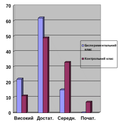 Дані таблиці свідчать про те, що учнів експериментальних класів мають міцніші знання, ніж учні контрольних класів. 17% і 59% учнів експериментальних класів виконали завдання на високому і достатньому рівнях, що 9% і 16% більше, ніж у контрольних класів.