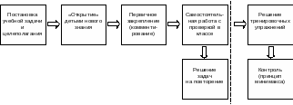 Так, сообщение темы и цели урока не обеспечивает постановку проблемы. Объяснение учителя не может заменить учебных действий детей, в результате которых они самостоятельно “открывают” новое знание. Принципиальными являются также различия между контролем и самоконтролем знаний. Следовательно, объяснительно-иллюстративный метод не может полноценно осуществлять цели развивающего обучения. Необходима новая технология, которая, с одной стороны, позволит реализовать принцип деятельности, а с другой — обеспечит прохождение необходимых этапов усвоения знаний, а именно: