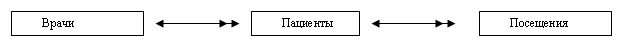 Еще одним важным свойством полученной БД является то, что между тремя отношениями существует взаимосвязь через общие поля. Отношения ПОСЕЩЕНИЯ и ПАЦИЕНТЫ связаны общим полем ФАМИЛИЯ. Отношения ПАЦИЕНТЫ и ВРАЧИ связаны через поле УЧАСТОК. Для связанных таблиц существует еще одно понятие: тип связи. Возможны три варианта типа связей: «один — к—одному», «один—ко—многим», «многие — ко — многим». В нашем примере между связанными таблицами существуют связи типа «один — ко — многим», и схематически они отображаются так: