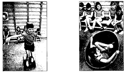 Адаптивное физическое воспитание строится с учетом индивидуального и дифференцированного подхода к регулированию физической нагрузки, физической подготовленности и сенсорных возможностей детей, а также с учетом эмоциональной насыщенности. Эмоциональность занятий зависит от разнообразия упражнений, от общего тона проведения занятий, интонации и команды преподавателя. Меняется тембр звука (громко, тихо, мягко, строго) с учетом психического состояния учащихся, их быстрой утомляемости, специфических особенностей развития и восприятия учебного материала. При обучении незрячих двигательным действиям используются альбомы с рельефным изображением различных поз и движений, наглядные пособия, адаптированный спортивный инвентарь. Например, при формировании навыков ориентировки, с целью самоконтроля, на чехле вдоль длины матраса пришита шелковая полоса шириной 4—5 см (рис. 2.11). К нетрадиционному спортивному инвентарю относятся: озвученные мячи, мячи с веревочкой, которая крепится к поясу, и ребенок, потерявший мяч, имеет возможность без посторонней помощи помощи его поднять, мяч с запохом ванилина, который пользуется как обонятельный ориентир; педальки для развития равновесия и формирования навыка правильной осанки (рис. 2.12, а); конус для развития вестибулярного аппарата (2.12, б) и многое другое.