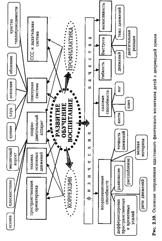 В процессе адаптивного физического воспитания осуществляются не только общие задачи — развитие, обучение, воспитание, которые совпадают с образовательными задачами здоровых детей и отражены в программных документах, но и специальные задачи. Они имеют коррекционную, компенсаторную, профилактическую, а в случае необходимости, лечебно-восстановительную направленность. Основные направления адаптивного физического воспитания для детей с депривацией зрения представлены на рис. 2.10.