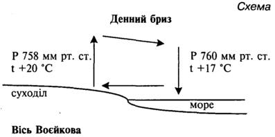 У результаті нерівномірного нагрівання суходолу і водної поверхні вдень над суходолом тепліше і тиск нижчий, а над водною поверхнею прохолодніше і тиск вищий − виникає денний бриз, що дме з моря на суходіл. І навпаки − вночі над водою тепліше, тиск нижчий, а над суходолом прохолодніше, тиск вищий, і виникає нічний бриз, що дме з суходолу на море.