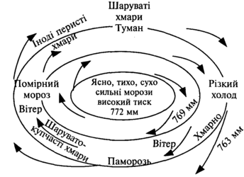 Виступ учня. Антициклон − це область з підвищеним тиском у центрі; для антициклону характерні низхідні потоки повітря, що спричиняє його нагрівання і не сприяє "конденсації водяної пари, не створює умов для випадання опадів. Погода в антициклоні безвітряна або зі слабким вітром, ясна. Узимку зумовлюються різкі похолодання, а влітку жарка посушлива погода.
