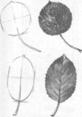 Курс малювання з натури в початкових класах починається з виконання малюнків листя груші або сливи (рис.4). Ці моделі нескладні за будовою і зручні тим, що їх можна роздати на кожну парту. Для цього листя наклеюють на паспарту попарно, щоб можна було порівняти між собою обидві форми предметів. Якщо немає готового паспарту, листя кладуть на аркуш білого паперу — тоді чітко видно загальні обриси кожної моделі [44, 75].