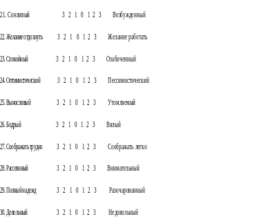 | Самочувствие | Чувство того, что ты сильный, полный сил, расслабленный, здоровый, свежий, бодрый и отдохнувший | Недостаточно хорошее самочувствие, присутствует чувство напряженности, усталости | Самочувствие плохое, чувство слабости, разбитости, чувство боли, усталости |