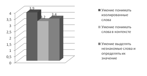 По результатам исходной диагностики лексических умений аудирования мы определили, что слабее всех у учащихся развито умение понимать слова в контексте, на хорошем уровне находится умение понимать изолированные слова, оставшееся умение выделять незнакомые слова и определять их значение занимает промежуточное значение (Рис.1).