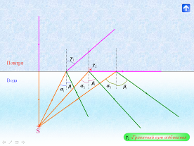 Доцільно звернути увагу учнів на те, що відбивання світла все ж ніколи не буває повним. Навіть для кутів падіння, близьких до 90°, частина енергії все-таки переходить у друге середовище. Проте у випадку падіння світла з оптично густішого в оптично менш густе середовище за певних умов можливе повне відбивання світла. І в цьому разі частка відбитої енергії зростає із збільшенням кута падіння, проте за іншим законом: починаючи з якогось кута падіння, що називається граничним, світло повністю відбивається від межі поділу. Це явище називають повним відбиванням (мал. 7). Часто його називають також явищем повного внутрішнього відбивання. Останнє твердження не суперечить попередньому, бо повне відбивання може бути тільки внутрішнім.