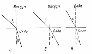 . Якщо з вакууму промінь світла падає на воду під тим самим кутом і (мал. 6, б), то кут заломлення α, як показує дослід, буде трохи більший за кут β для скла. А абсолютний показник заломлення для води