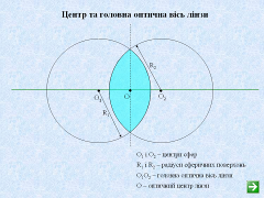 Як і при заломленні на плоских поверхнях, тут доцільно розглянути практично важливий випадок – заломлення гомоцентричних пучків променів світла на прозорій речовині, обмеженій сферичними поверхнями. Такий пристрій називають лінзою (мал. 8). Пряма, що проходить через центри кривизни заломлюючих поверхонь О і О1, називається оптичною віссю. Оптична вісь перетинає заломлюючі поверхні в точках А і В. Для дуже тонких лінз, які ми розглядатимемо, ці дві точки зливаються в одну, яку називають оптичним центром лінзи.