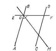 Параллельные прямые АВ и CD пересечены прямой EF, величина одного из внутренних углов при точке О (рис. 1 ) равна 130°. ОМ – биссектриса этого угла. Определить величину угла, образованного ею с прямой CD.