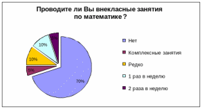 Подавляющее большинство учителей начальных классов (70%) внеклассные занятия по математике не проводят вообще, некоторые проводят лишь комплексные занятия, равно немногие указали, что проводят внеклассные занятия по математике редко и один раз в неделю и совсем малый процент тех, кто проводит внеклассные занятия по математике два раза в неделю. Процентное соотношение этих групп представлено на диаграмме12.